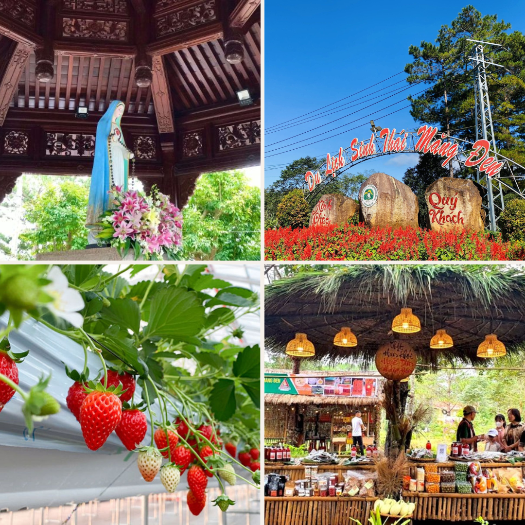 Tượng Đức Mẹ Măng Đen: điểm đến linh thiêng giữa đại ngàn, là biểu tượng tôn giáo nổi bật của vùng đất cao nguyên Kon Plông. Bức tượng nhỏ nhắn, được chế tác từ đá trắng với chiều cao khoảng 1 mét, mang gương mặt hiền hậu, ánh mắt từ bi như dang rộng vòng tay chở che, an ủi những tâm hồn tìm kiếm sự bình yên. Không chỉ là nơi hành hương quen thuộc của bà con giáo dân địa phương, tượng Đức Mẹ còn thu hút đông đảo du khách từ khắp nơi đến cầu nguyện, chiêm bái.