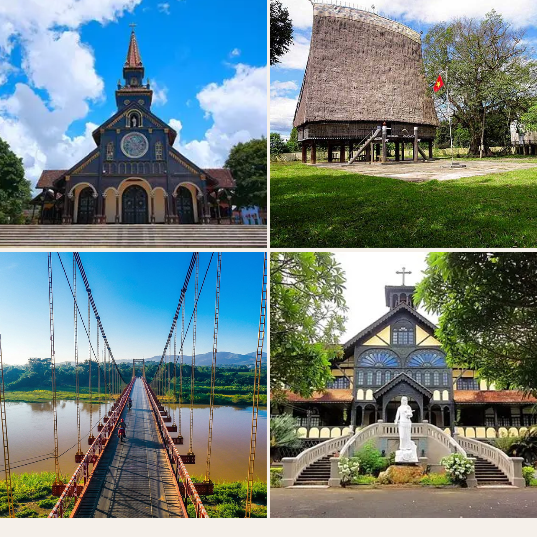 Nhà thờ gỗ Kon Tum: nổi bật với kiến trúc độc đáo, kết hợp hài hòa giữa phong cách Roman và nhà sàn gỗ của người Ba Na. Được xây dựng hoàn toàn bằng gỗ sến đỏ – loại gỗ quý của Tây Nguyên, công trình không chỉ mang giá trị tâm linh mà còn là điểm check-in lý tưởng với nhiều góc chụp ảnh ấn tượng, thu hút đông đảo du khách ghé thăm.