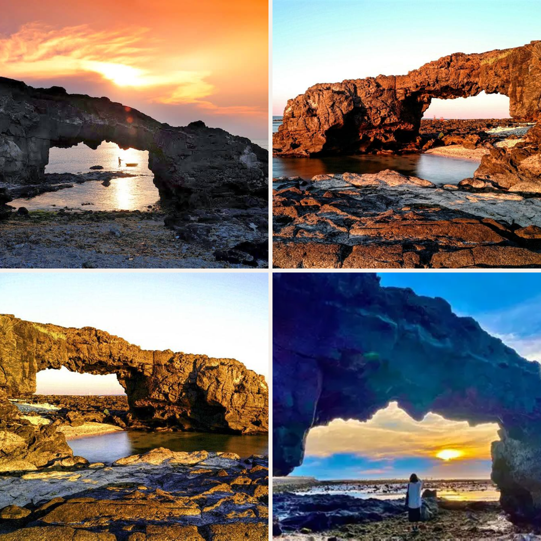 - Cổng Tò Vò: được hình thành từ nham thạch núi lửa cổ xưa, qua hàng nghìn năm bào mòn bởi sóng biển và gió trời. Khối đá nguội lạnh giờ đây vươn cong mềm mại giữa nền trời và biển xanh, trở thành điểm check-in ấn tượng bậc nhất trên đảo. Đặc biệt, khi hoàng hôn buông xuống, Cổng Tò Vò là nơi lý tưởng để du khách chiêm ngưỡng khoảnh khắc mặt trời chìm dần xuống biển, tạo nên khung cảnh lãng mạn khó quên