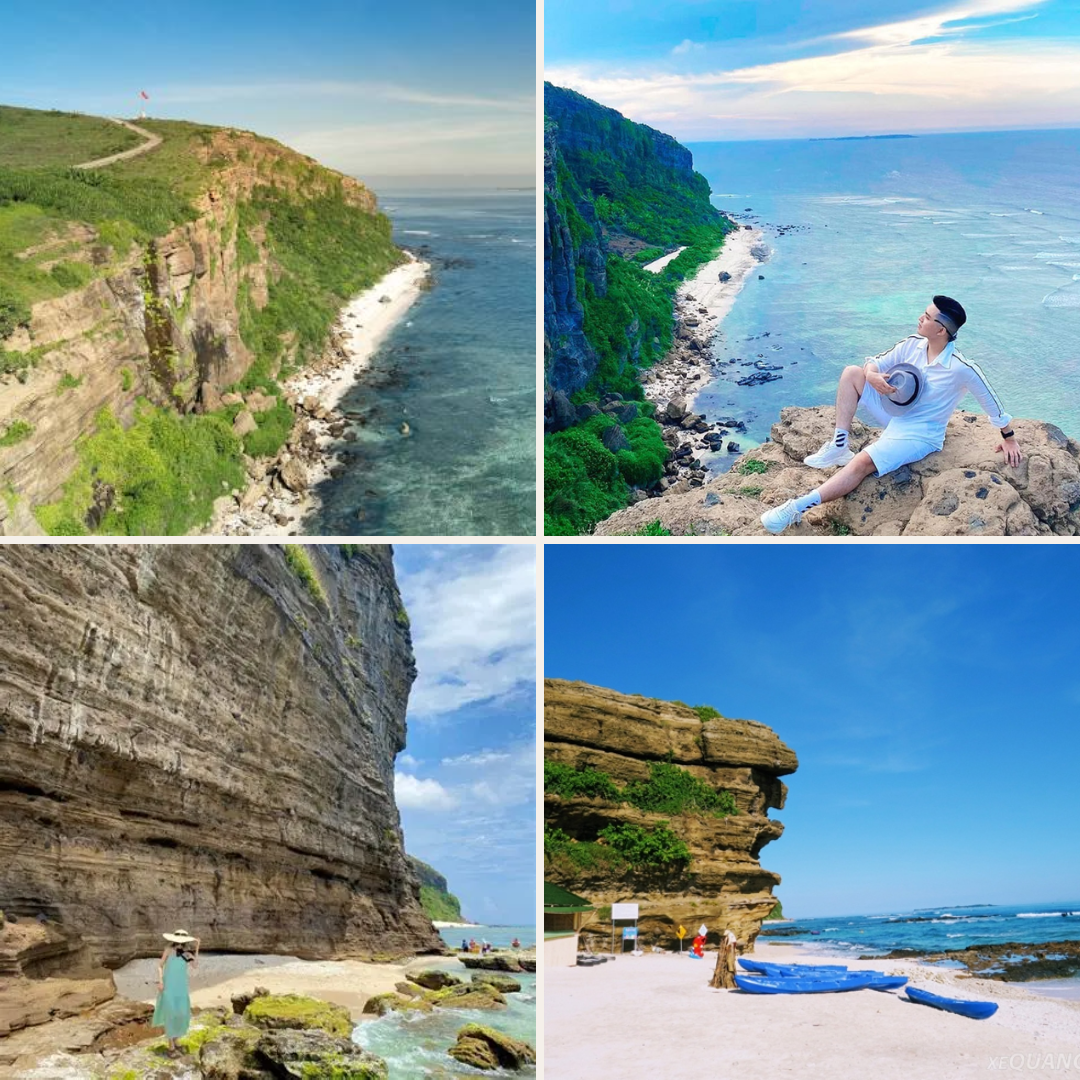 - Hang Câu: nổi bật với những vách đá dựng đứng từ nham thạch núi lửa, được sóng biển và gió trời chạm khắc qua hàng triệu năm. Lớp đá sẫm màu phủ thảm rau câu xanh mướt tạo nên bức tranh hoang sơ mà nên thơ giữa lòng biển đảo. Đến đây, du khách có thể dạo bước trên bãi cát trắng mịn, lắng nghe tiếng sóng rì rào, hít hà làn gió mát từ đại dương.
