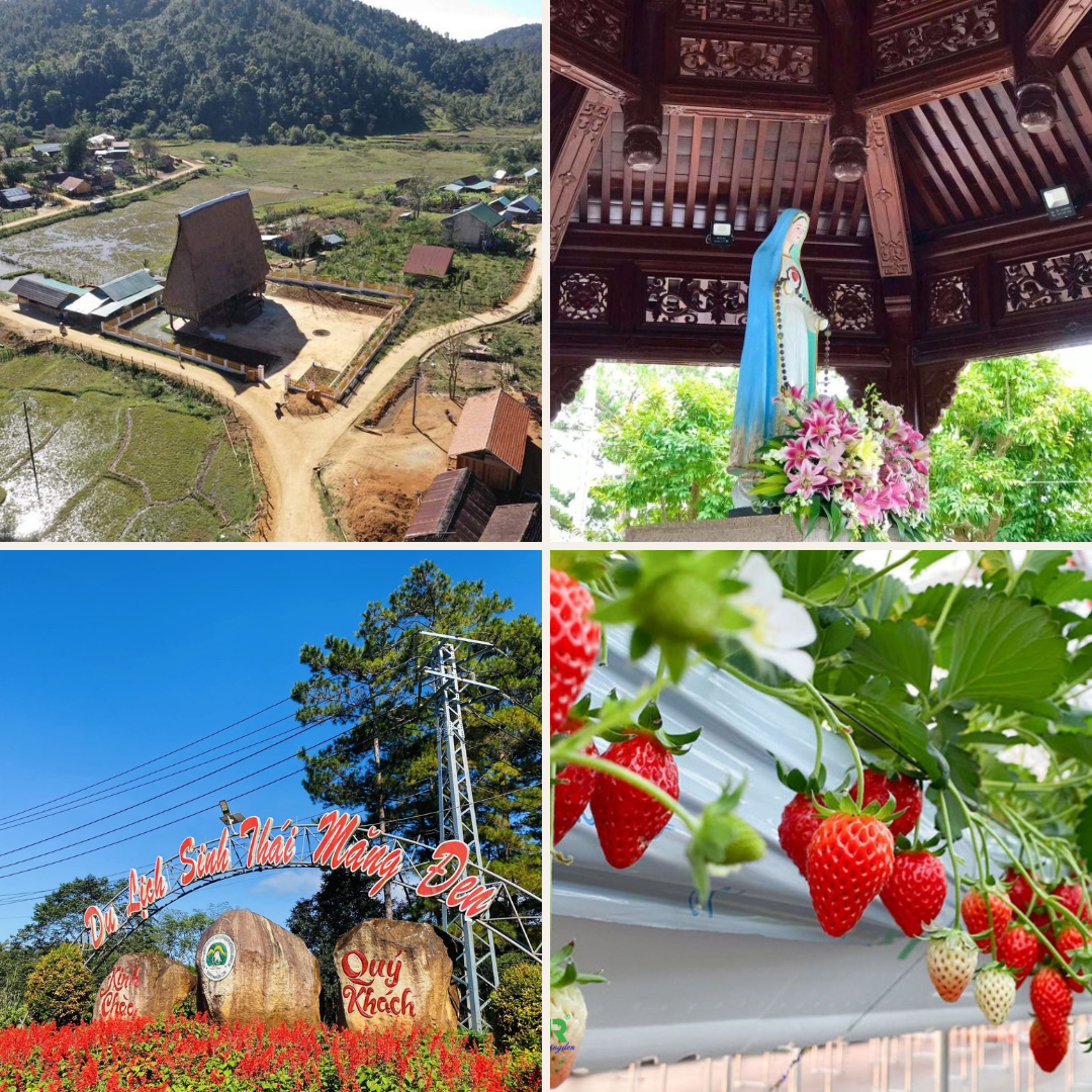 - Tượng Đức Mẹ Măng Đen: một biểu tượng tôn giáo thiêng liêng và nổi tiếng tại vùng đất cao nguyên Măng Đen. Bức tượng được tạc từ đá trắng, cao khoảng 1 mét, với dáng vẻ hiền từ, bao dung, thể hiện sự che chở và lòng nhân ái. Đây là điểm hành hương quan trọng không chỉ đối với người dân địa phương mà còn với du khách thập phương tìm đến để cầu nguyện và tìm sự bình an trong tâm hồn. Không chỉ mang giá trị tâm linh sâu sắc, nơi đây còn là một điểm dừng chân thanh bình giữa thiên nhiên hoang sơ, thu hút những ai muốn tạm rời xa cuộc sống xô bồ, lắng đọng giữa không gian núi rừng trong lành, tĩnh lặng.